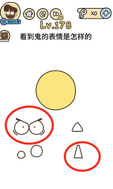 《脑洞大大大》关卡178:看到鬼的脸色是怎么样的?谜底操作方式:将眼睛和第二排第二个惊奇的嘴放到圆形里。