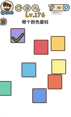 《脑洞大大大》关卡176:哪个颜色最轻?谜底【紫色】操作方式:将所有颜色的格子移动平放,最轻的颜色会往上浮动到最高。