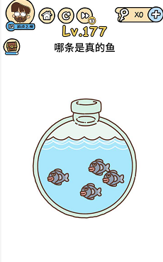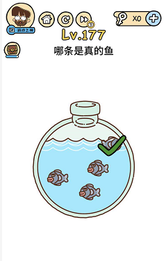 《脑洞大大大》关卡177:哪条是真的鱼。谜底操作方式:用手指按住瓶口,然后摆布摇摆手机,会有一条鱼浮起来,点击浮起来的鱼。