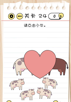 脑力测试过关攻略关卡24:请点击小牛。谜底攻略:本关要找小牛,将两端大牛移动到一路,它们就会出产出小牛,然后点击小牛即可。