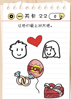 脑力测试过关攻略关卡22:让他们爱上对方吧!谜底攻略:将钻石戒指移动到男孩女孩面前晃荡,气球也爆炸了,然后男孩展开了眼睛醒来,看到女孩他们爱上对方了。