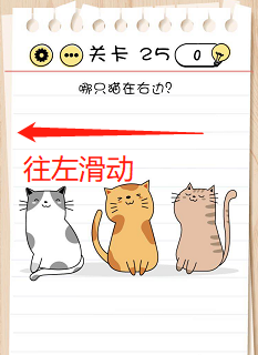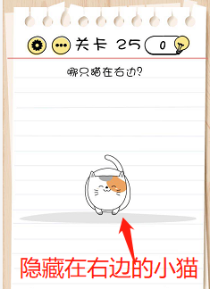 脑力测试过关攻略关卡25:哪只猫在右边?谜底攻略:不要点击图片上可见的小猫了,它们都不在右边,将手机屏幕往左边滑动就可以找到埋没在右边的小猫了。