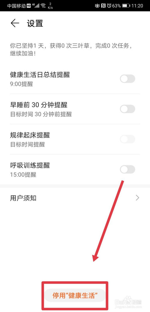 然后再在设置页面底部找到停用“健康糊口”按钮,我们点击该按钮;