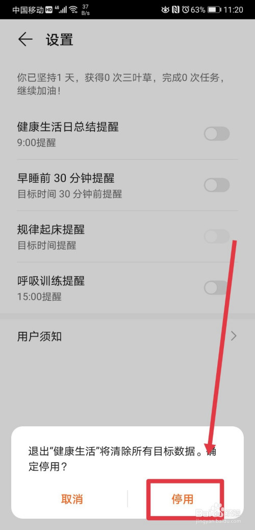 点击停用“健康糊口”按钮,会弹出友情提醒,若是我们确定封闭的话,可以不消理会,直接点击停用即可。