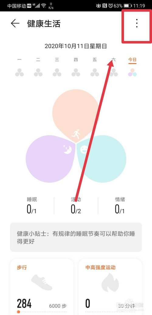 进入到健康糊口页面后,再点击该页面右上角的三点标记,打开功能选项;