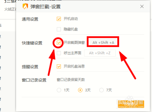 单击勾选【弹窗阻挡-设置】对话框中的【快捷键设置】选项后,记住这里的快捷体例,今后再有弹窗弹窗,即可利用快捷键截图阻挡