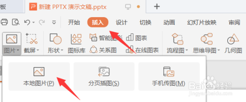 打开PPT文件,选择菜单栏的插入--图片--当地图片。
