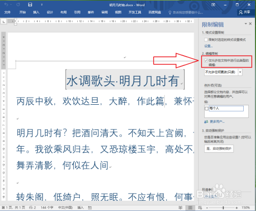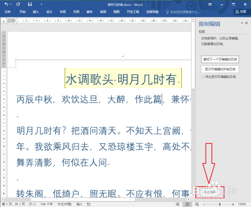 ●打开示例文档,可以发现可编纂区域“水调歌头.明月几时有”黄色底纹显示;