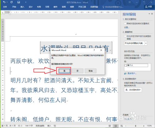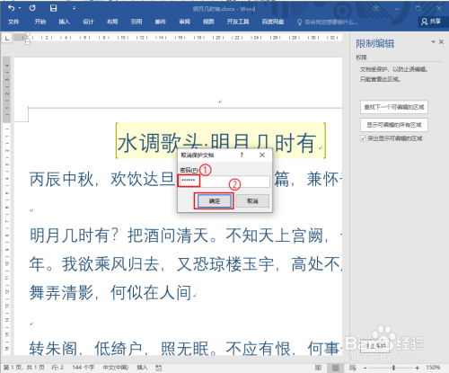 可以发现“水调歌头。明月几时有”的底纹消逝,限制编纂打消。