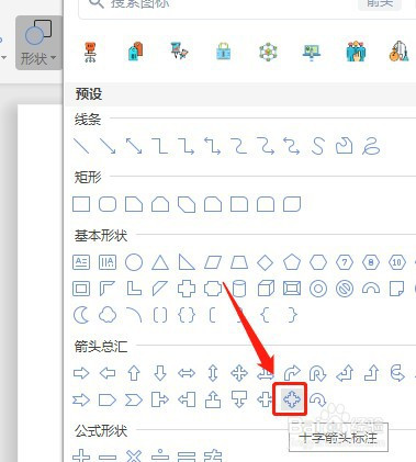 在外形里面找到箭头汇总里面的十字箭头标注图标,单击十字箭头标注