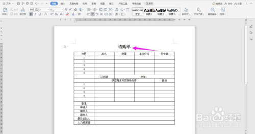 然后在表头的上方输入“请购单”,这样请购单就建造完当作了
