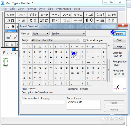 在符号面板中,找到并点中标的目的左的加长箭头,然后点击“插入”,具体如图所示:
