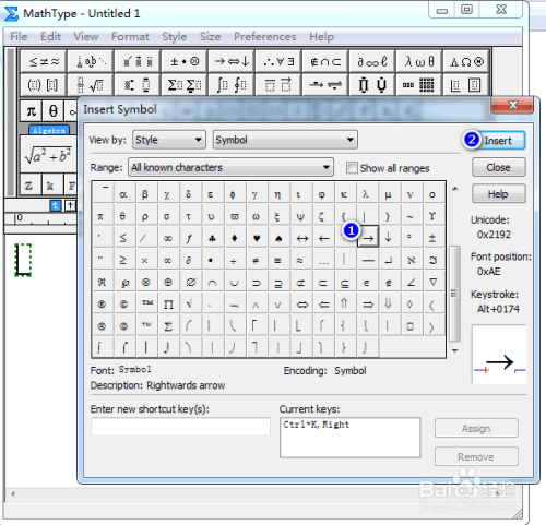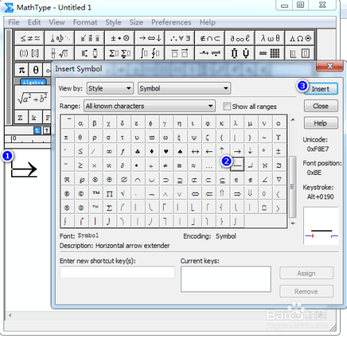 在符号面板中,找到并点中标的目的右的加长箭头,然后点击“插入”,具体如图所示: