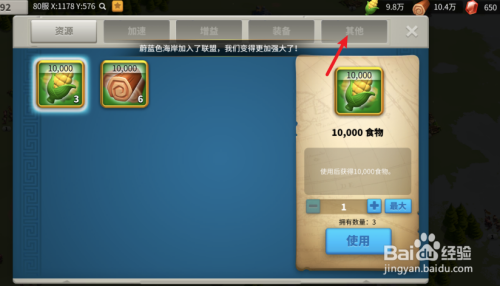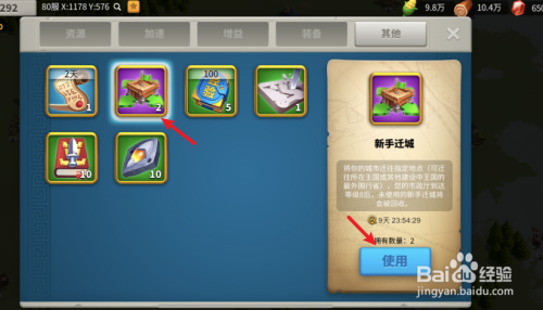 选择新手迁城道具,点击利用。
