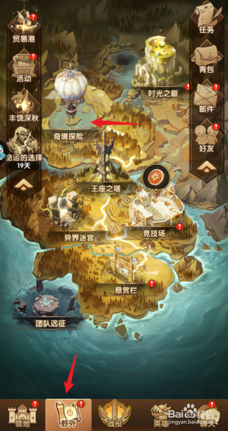 进入剑与远征游戏后,点击野外的选项,选择奇境探险进入。