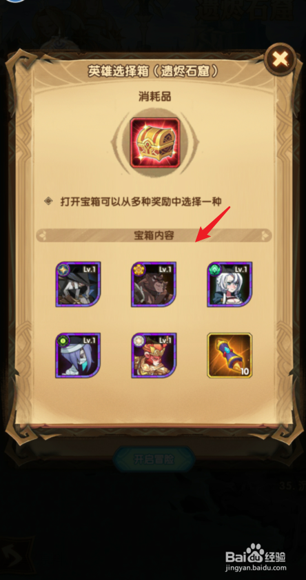 获得英雄选择箱后,可以在6个道具内选择一个喜好的英雄或者道具。