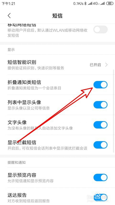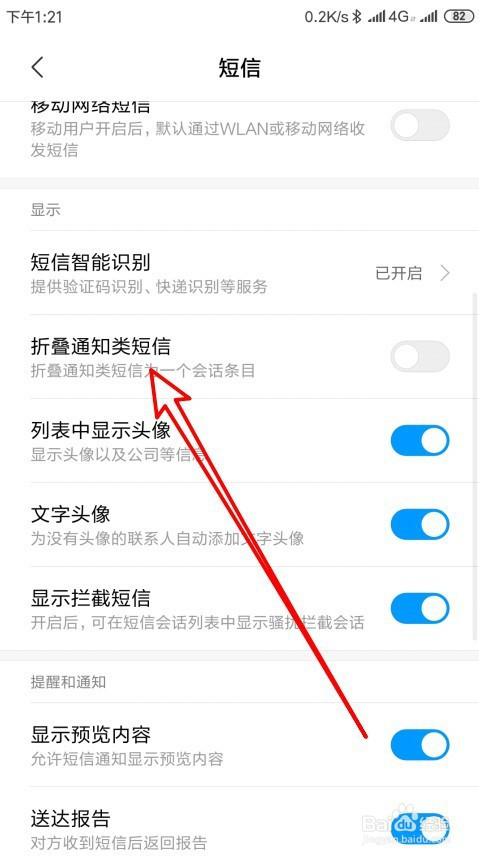 然后在打开的短信设置页面中找到折叠通知类短信的设置项。