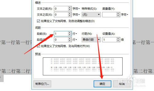 在弹出的菜单中,在段前和段后的输入框中输入0或者1,然后点击确定按钮。