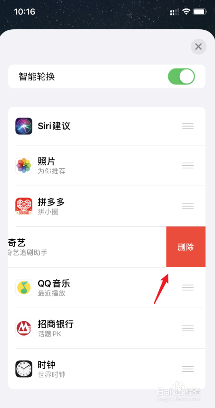 在编纂界面,标的目的左侧滑动需要删除的叠放组件。