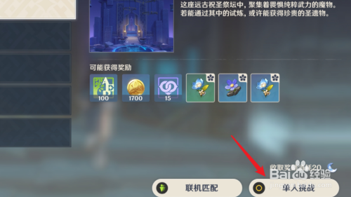 之后,点击右下方的单人挑战选项,完当作挑战之后,即可获得圣遗物。