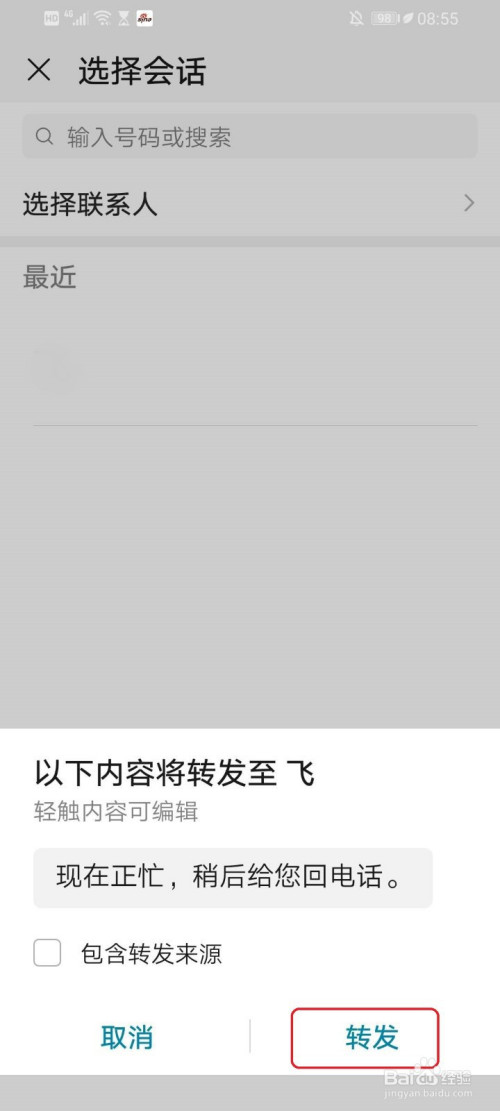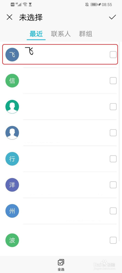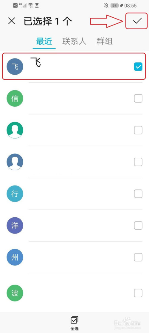 勾选要转发的联系人,例如“飞”。