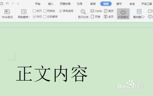 点击之后,word文档内容编纂页面布景就酿成淡绿色了,如图所示。