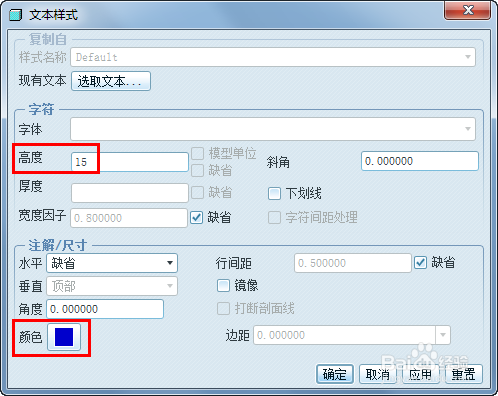 在文本样式对话框内,我们可以点窜文字大小、字体和颜色等。我们这里点窜字体高度和颜色两项。高度直接输入新的数字,点击颜色图标后,在颜色对话框中选择文字需要的颜色。