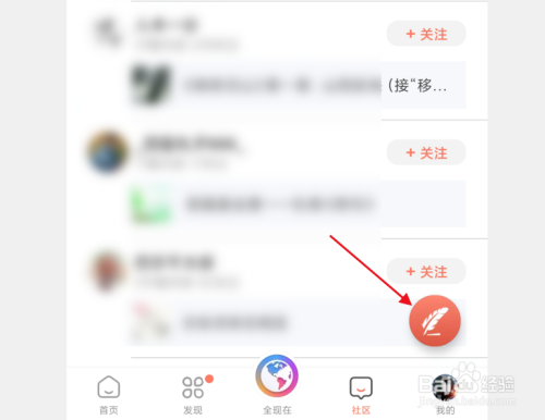 进入社区后,点击右下角的红色羽毛按钮。