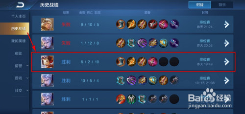 3、切换左侧栏目到“汗青战绩”,之后选择本身想要查看的对局
