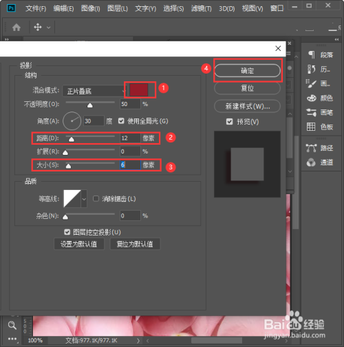 我们把夹杂模式的颜色设置为深红色,然后调整距离和大小,点击【确定】,如图所示。