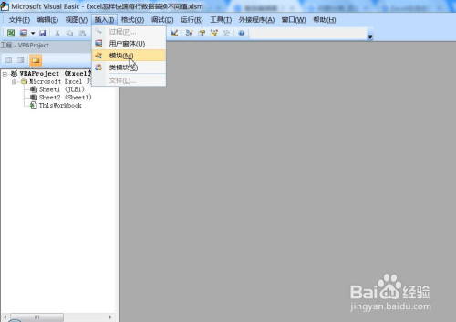 然后按下快捷键ALT+F11打开VBE(宏)编纂界面,然后点菜单栏【插入】下拉中列表中点【模块(M)】如图。