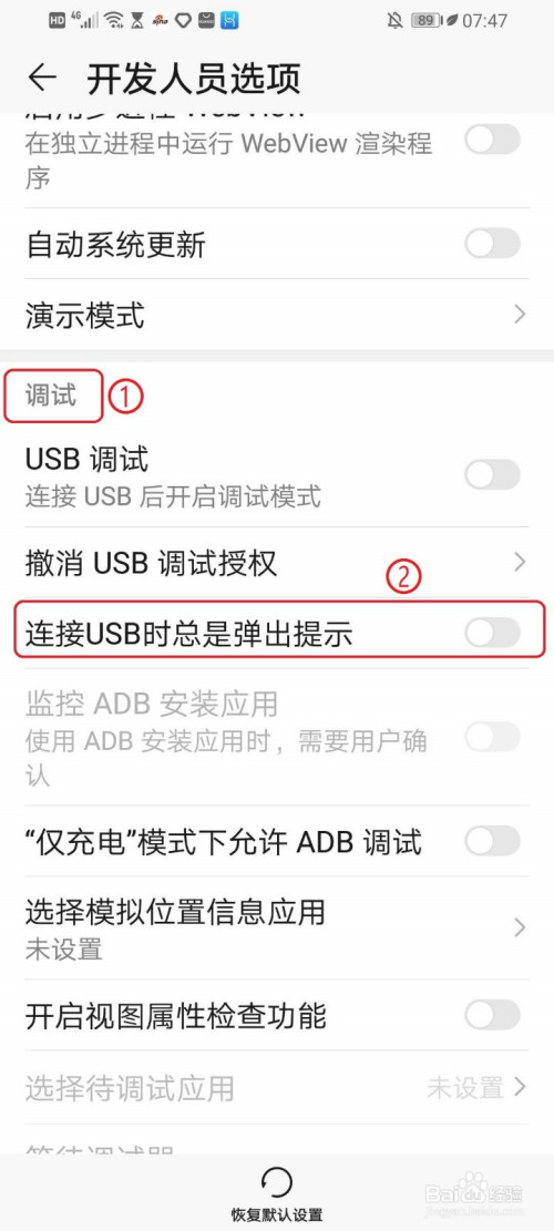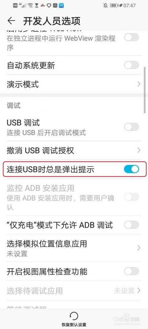 找到“调试”选项栏,然后点击“毗连USB时老是弹出提醒”右侧的开关。