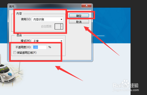 6.然后将内容设置为内容识别,不透明度设置为100%。选择“确定”按钮。