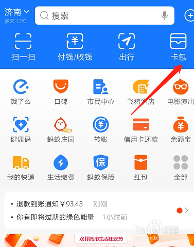 在支付宝首页点击卡包。