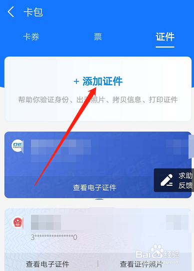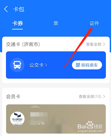 在卡包页面,切换到证件。