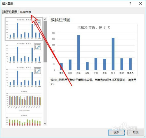 这时会打开插入图表的窗口,点击所有图表选项卡。