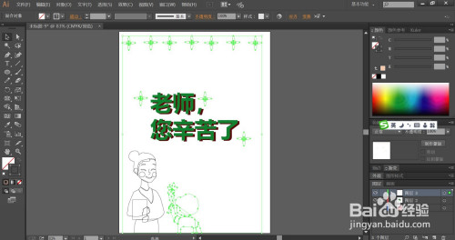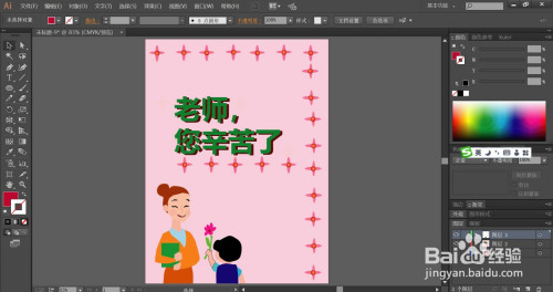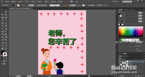 利用天蓝色与深蓝色搭配填充学生的衣服,再用黑色与粉色搭配填充学生的头发与脸蛋,再用圆形工作画出小的花朵润色贺卡的上边与右边,我们完当作贺卡设计。