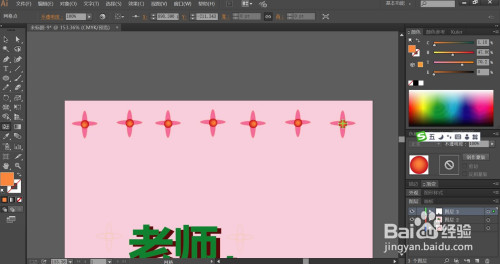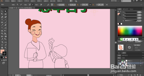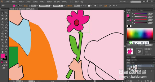 利用钢笔画出学生拿花给教员的动作路径,再用绿色与品红色搭配填充枝条与花瓣,再用红色填充花蕊。
