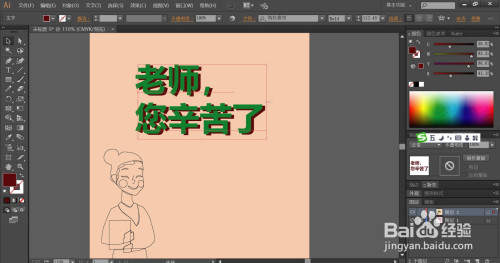 利用黑色填充教员的眉毛与眼睛,利用暗粉色填充腮红与鼻梁,再用红色填充嘴唇,利用桔黄色填充上衣,再用黄褐色填充裙子,利用粉色填充手掌,再用绿色填充书本。