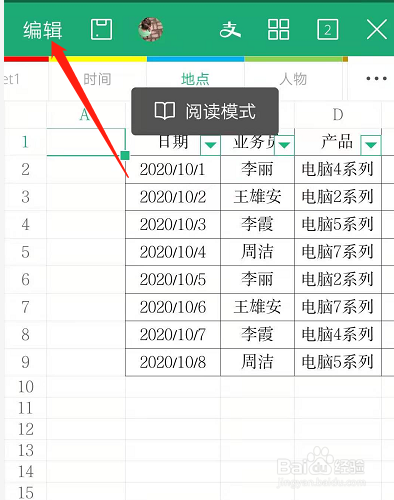 打开手机WPS表格,点击编纂,有阅读模式切换到编纂模式。