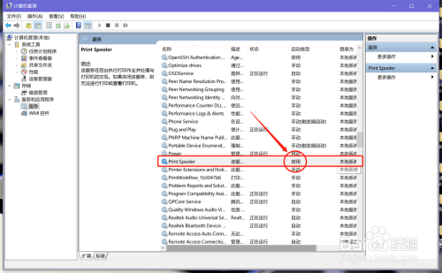 这时回到办事列表页面,可以看到Print Spooler办事为禁用状况,这样就完当作封闭电脑打印机办事啦。