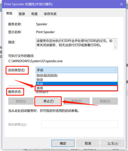 在Print Spooler的属性页面,将启动类型改为禁用,办事状况点击遏制,然后点击右下方应用-->确定。