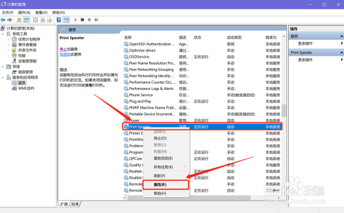 在右侧办事列表中找到Print Spooler办事,鼠标右键,选择【属性】。