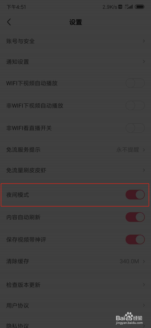 在设置页面中,点击夜间模式后面的开关。