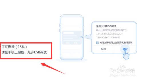 接着在宙常手机上授权许可USB调试,点击“强戴确定”。