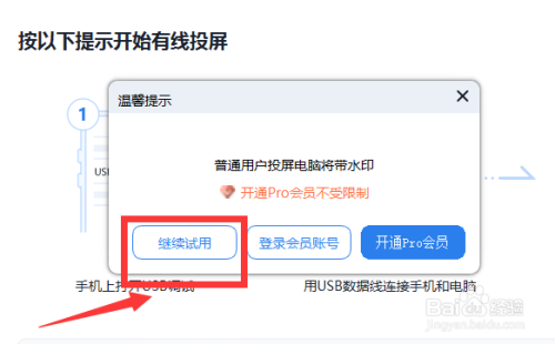5.然后弹出温馨提醒窗口里,选择“继续试用”。