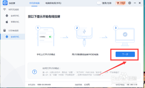 随后在快投屏本家儿页,选择左侧的USB有线投罩盆距(安卓手机)。