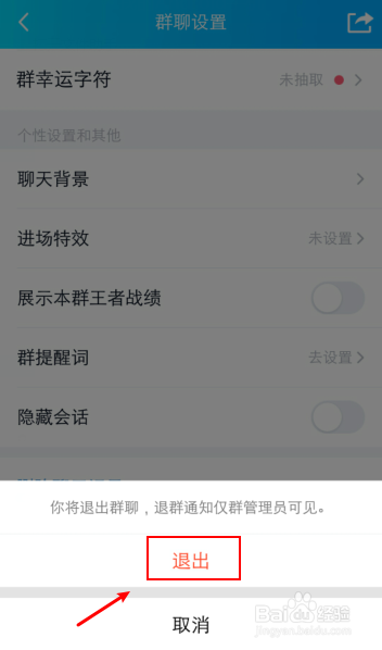 呈现选项,点击【退出】,这样qq群本家儿已经退群了, 群不散。