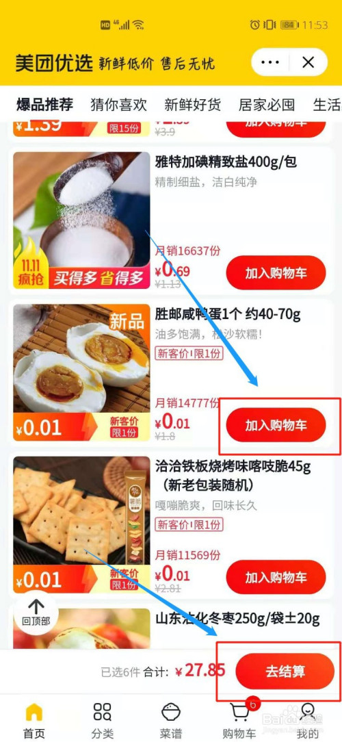 4.接着遴选商品,点击插手购物车。之后选择去结算。