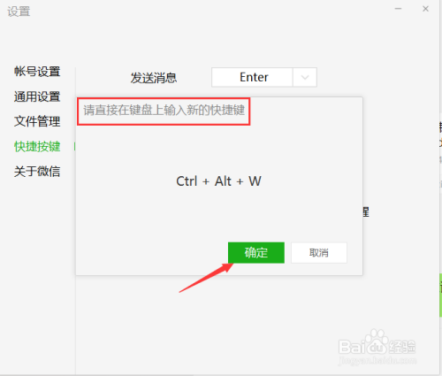 点击方框后弹出这个界面,我们直接在键盘上输入新的快捷键,中心就会显示您所输入的内容,点击【确定】;